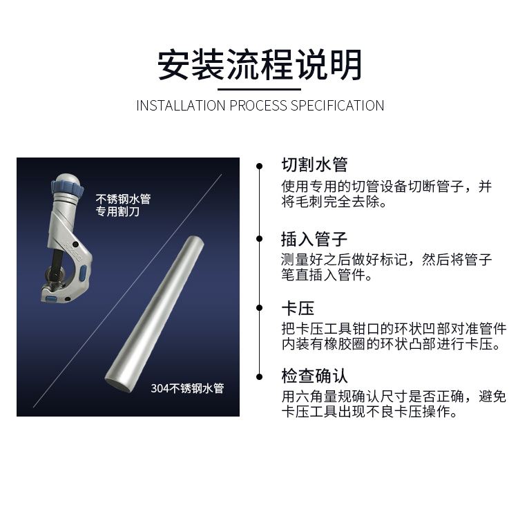 卡壓式連接~分單卡壓跟雙卡壓兩種,由德國率先垂范搭配使用的卡壓式管件,連接強度高,抗震動,滿足嵌入式安裝的要求,極大地減少了隱蔽環境中水管漏水的可能性,滿足了國家CECS153:2003標準,適合DN15-DN100口徑管道使用,避免明火焊接操作。